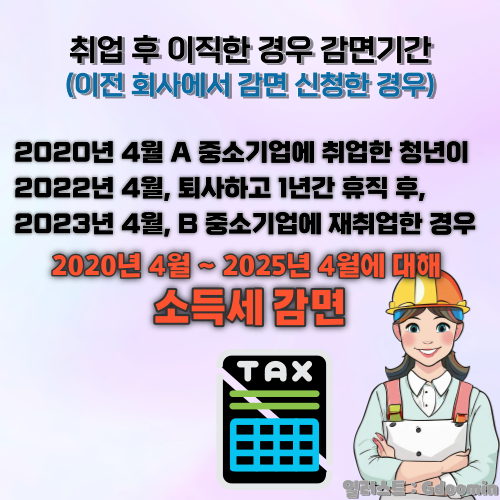 취업 후 이직했을 때 그 전 회사에서 감면 신청을 한 경우 중간에 휴직하였어도 초기년도부터 기산하여 5년을 책정합니다.