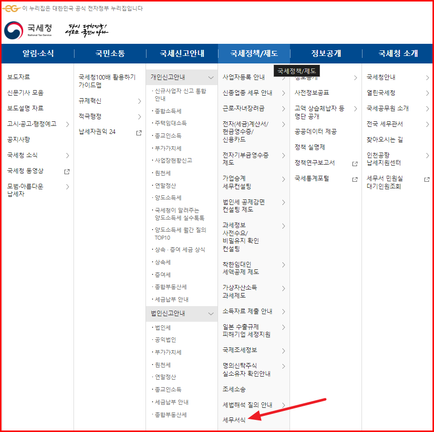 👉 국세청 홈페이지 > 상단 '국세정책/제도' > 세무서식