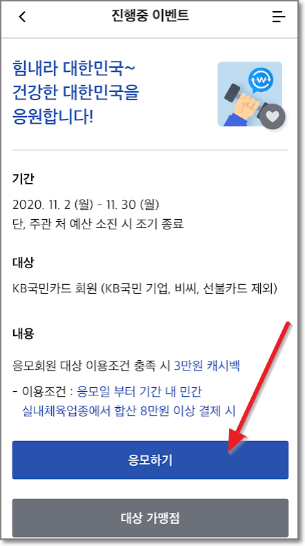 로그인 상태에서 "응모하기"를 누르면 완료가 되며, 대상가맹점을 눌러보면 본인이 가고자하는 헬스장 또는 휘트니스 센터를 검색해보실 수 있습니다.  대부분의 헬스장은 되지만 혹시 모르니 검색은 꼭 해보시기 바랍니다.