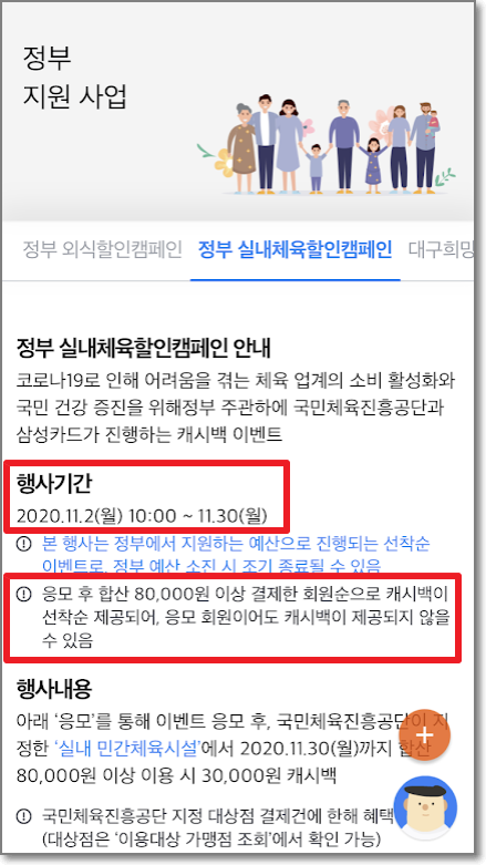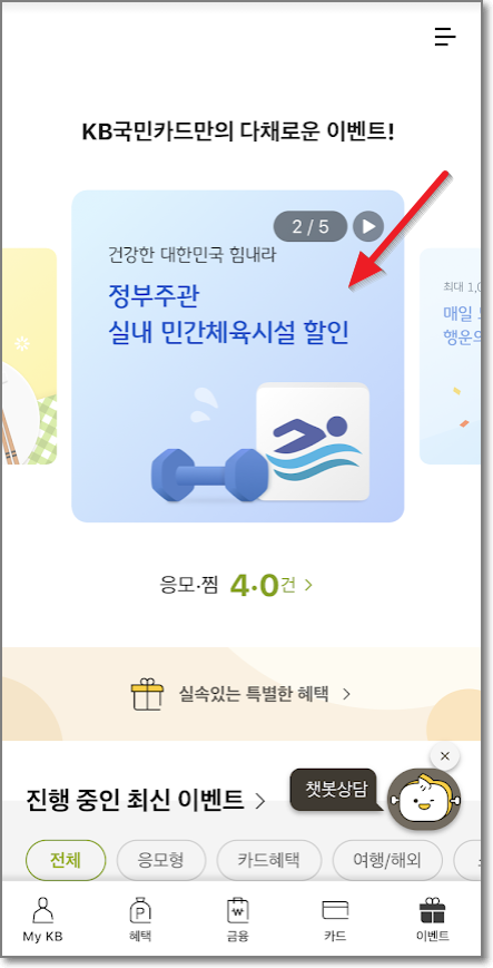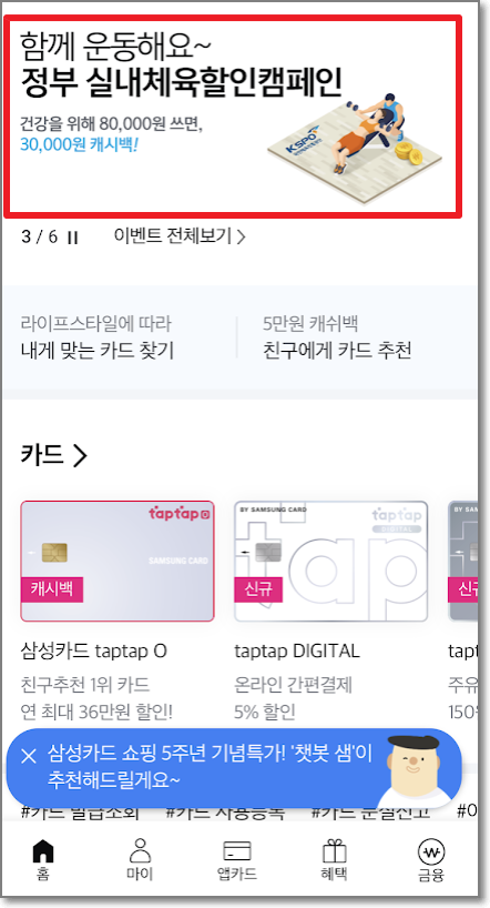 삼성카드 역시 앱을 실행하고 로그인을 하시면 바로 "함께 운동해요~정부 실내체육할인캠페인"이라고 나옵니다.