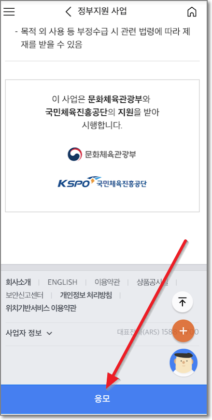 앱실행하고 로그인 하면 바로 딱! 뜹니다. "정부주관 실내 민간체육시설 할인"!! 바로 눌러줍니다.