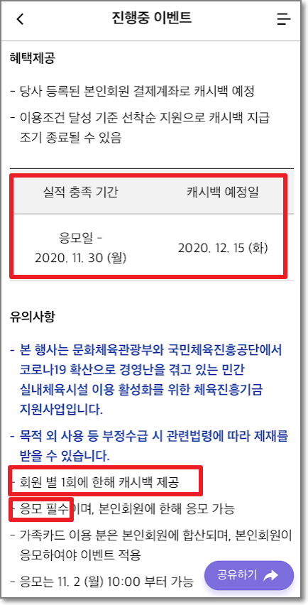이상으로 체육시설 할인쿠폰 3만원 환급방법에 대해서 알아보았습니다. 반드시 "응모"부터 해야 한다는점과 동네 헬스장이 이벤트에 해당되는지는 꼭 검색을 해보고 방문하시기 바랍니다.