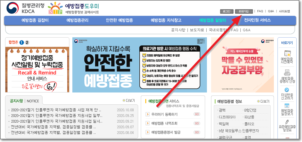 링크한 "질병관리청 예방접종도우미"로 들어가면 새창이 열립니다. 여기서 화살표친 "회원가입"을 클릭합니다.