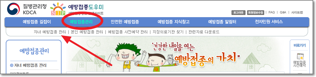 로그인을 하고 예방접종관리 쪽에 마우스를 가져다 대면, 메뉴가 나오는데요. 여기서 "자녀 예방접종 관리"를 누릅니다.