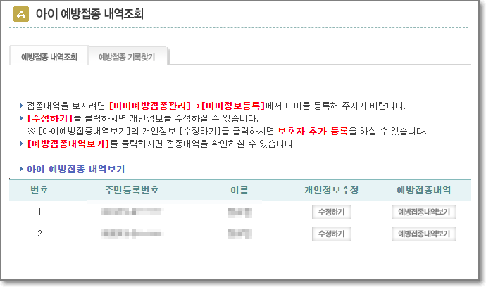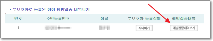 제대로 아이정보가 나오는지 확인해보기 위해서 "예방접종내역보기"를 눌러보세요.