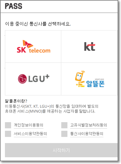 사용하는 통신사를 선택하시고, 개인정보이용동의, 고유식별정보처리동의, 서비스이용약관동의, 통신사이용약관동의를 모두 체크하고 "시작하기"를 눌러서 인증을 진행합니다.