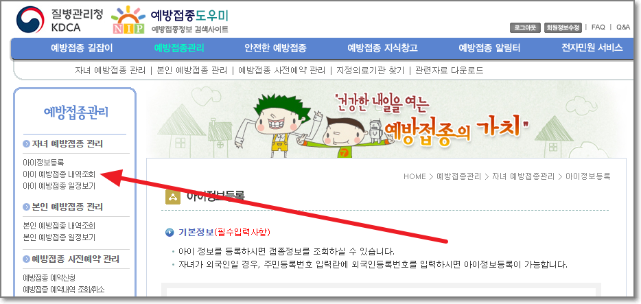 왼쪽에 있는 "아이 예방접종 내역조회"를 누르면,