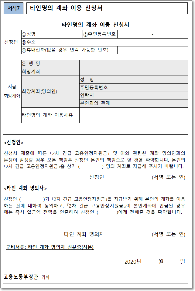 원칙은 본인명의로 지급을 받아야 하나, 피치못할 사정으로 본인명의계좌이용이 불가할 시 타인명의 계좌를 제출해도 되지만, 아래의 서식7을 반드시 함께 제출해야 합니다.