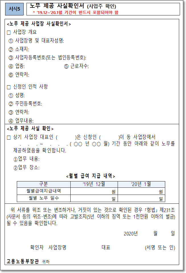 서식 5는 "노무제공 사실 확인서(사업주 확인)" 입니다. (사업주가 적어주어야 하는 것입니다.)