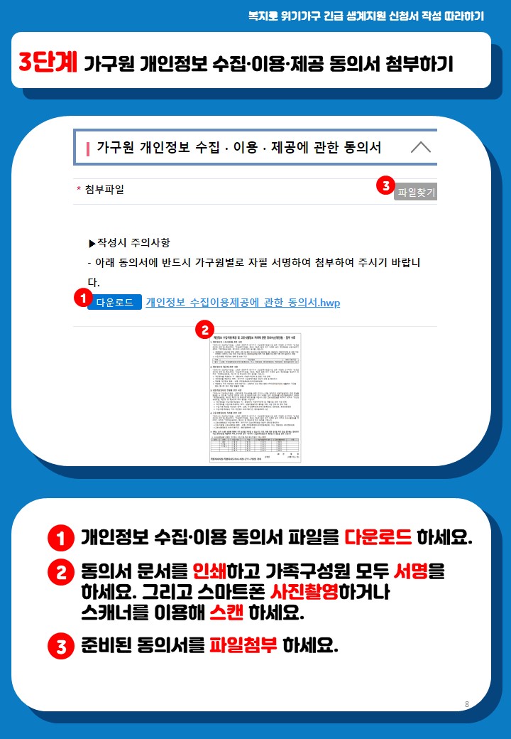 개인정보 수집. 이용 동의서 파일을 아래에서 다운로드해서 인쇄하고 모두 서명을 하시고, 스마트폰 사진촬영을 하거나 스캐너를 이용해서 스캔하시고 만들어진 파일을 파일 첨부 하세요.