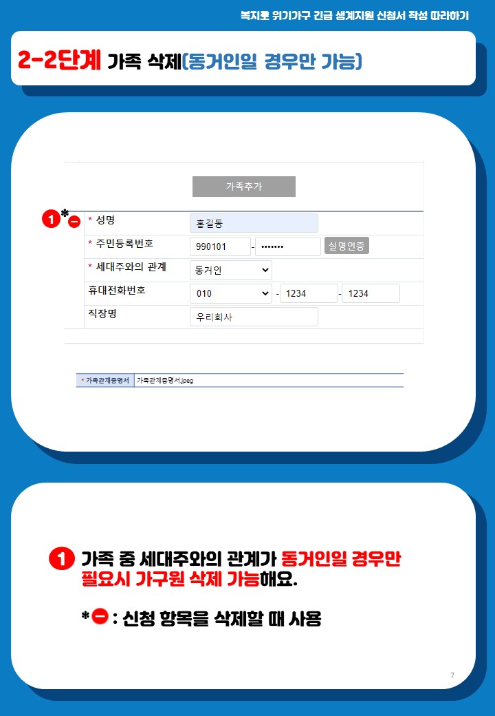 가족중에서 세대주와의 관계가 "동거인"일 경우만 필요시 "가구원 삭제"가 가능합니다.