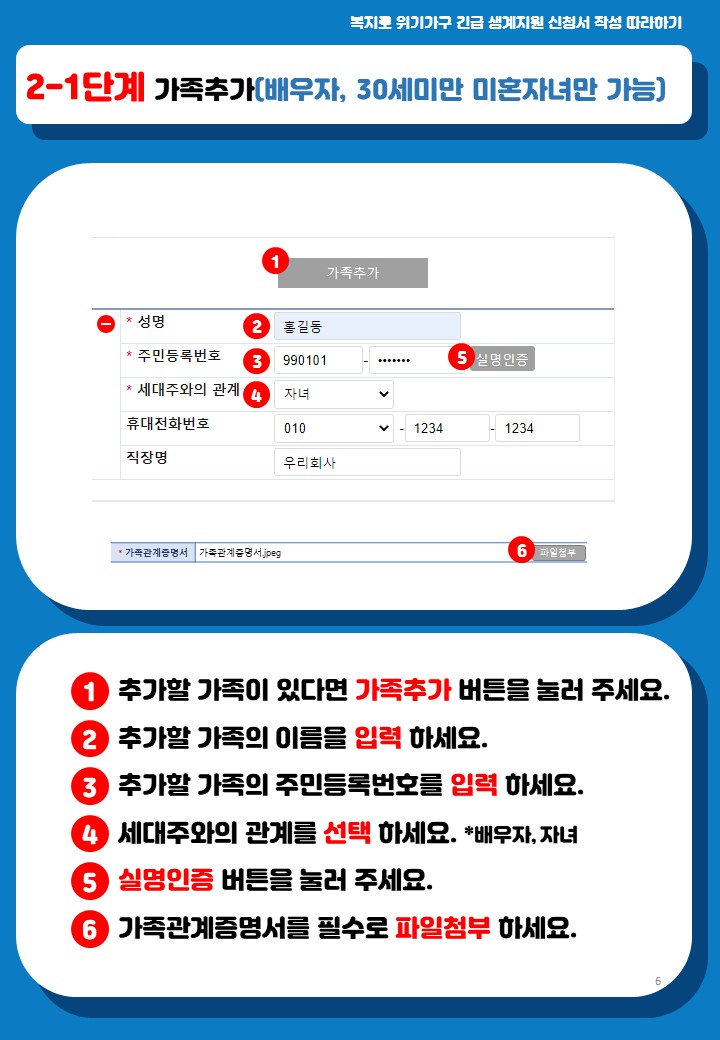 배우자(남편 또는 아내)와 30세가 안된 결혼하지 않은 자녀만 추가할 수 있습니다. 가족관계증명서를 필수로 첨부해야 합니다.