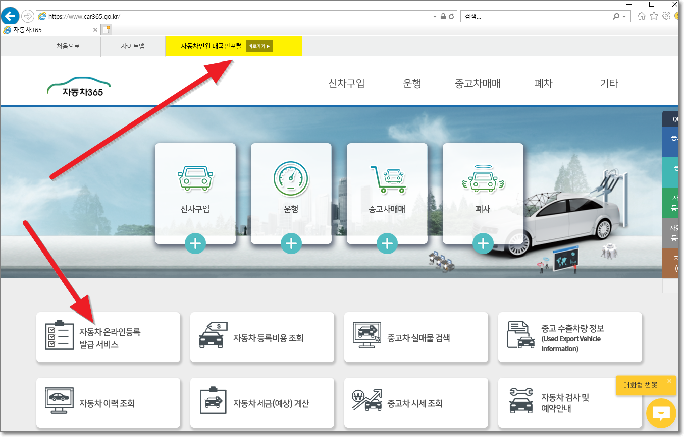 위에 있는 "자동차민원 대국민포털 바로가기"를 눌러도 되고, 아래있는 "자동차온라인등록 발급 서비스"를 눌러도 됩니다.