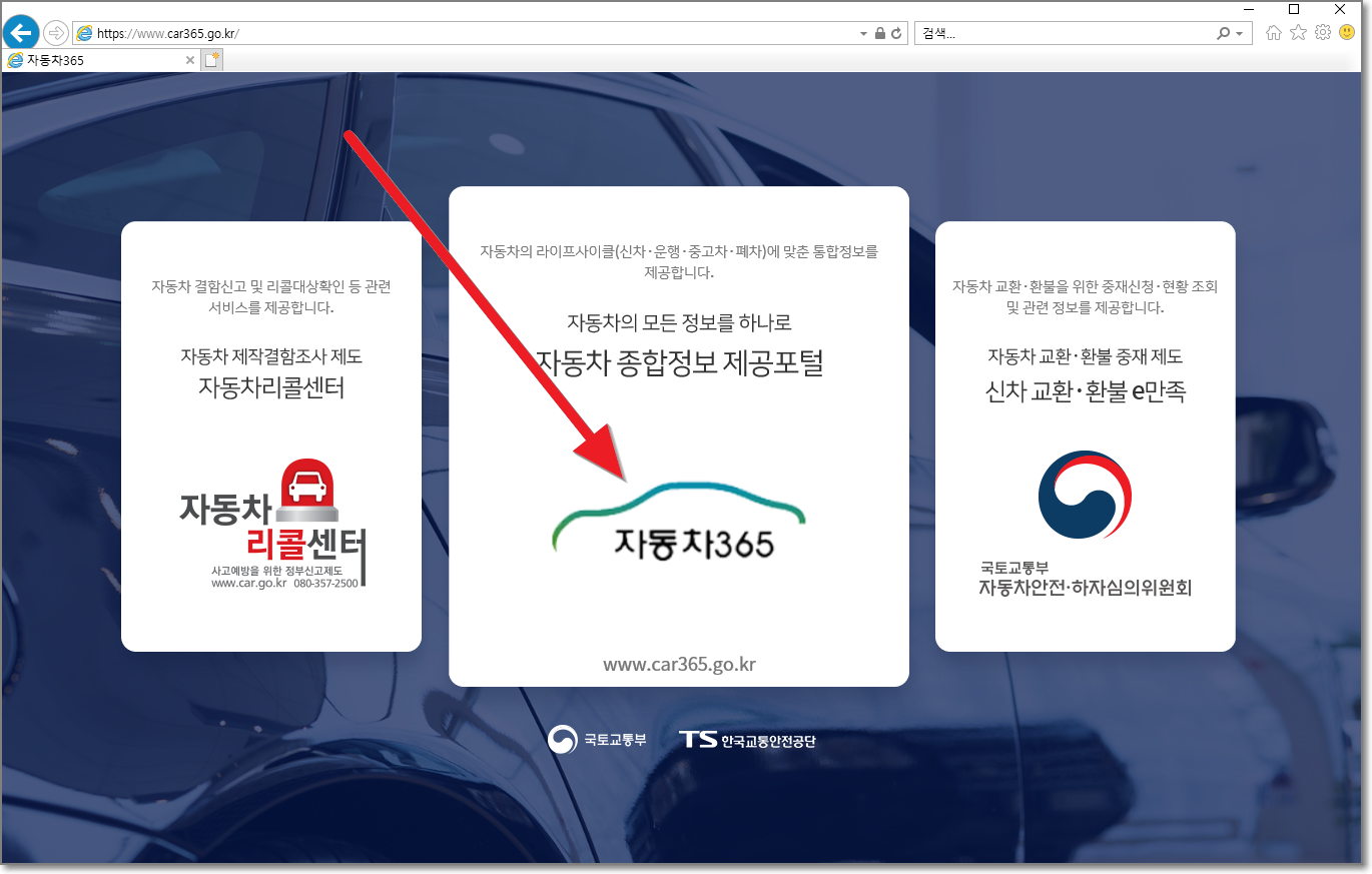 자동차민원 대국민포털로로 가려면 우선 카365로 들어가야 합니다. 카365주소는 www.car365.go.kr 입니다. 마우스로 긁어서 복사하시고요.