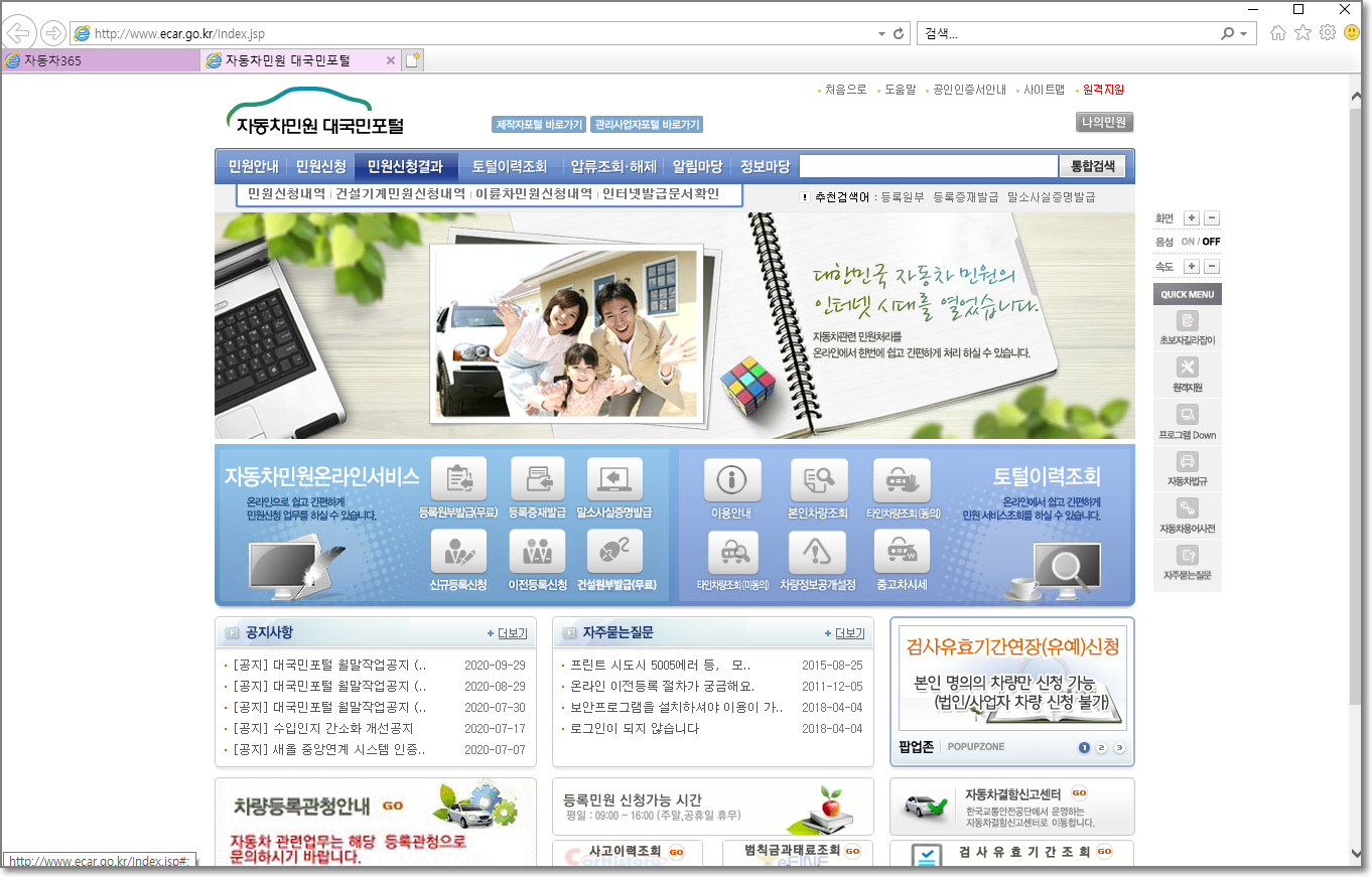 그럼 아까 처음과는 다르게 "익스플로러32비트로 실행하세요"이런말이 안나오는 깨끗한 화면이 나옵니다. 이제 여기서 필요하신 업무를 보시면 됩니다. 참, 이곳(자동차민원 대국민포털)에서도 공동명의로 변경건은 안됩니다. 공동명의건은 꼭 방문해서 처리하셔야 합니다.