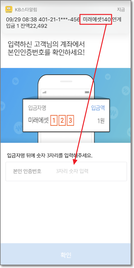 저는 국민은행으로 했더니 알림으로 오네요. 미래에셋 140이라고 왔습니다. 1원 입금했고요. 미래에셋 뒤에 온 숫자 3개를 밑에 본인 인증번호에 입력합니다. 저는 140입니다.