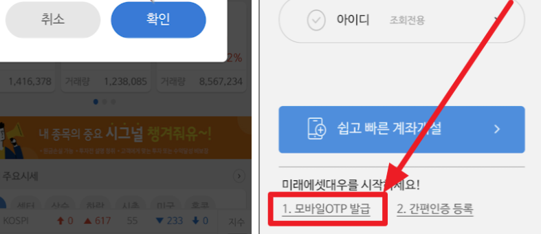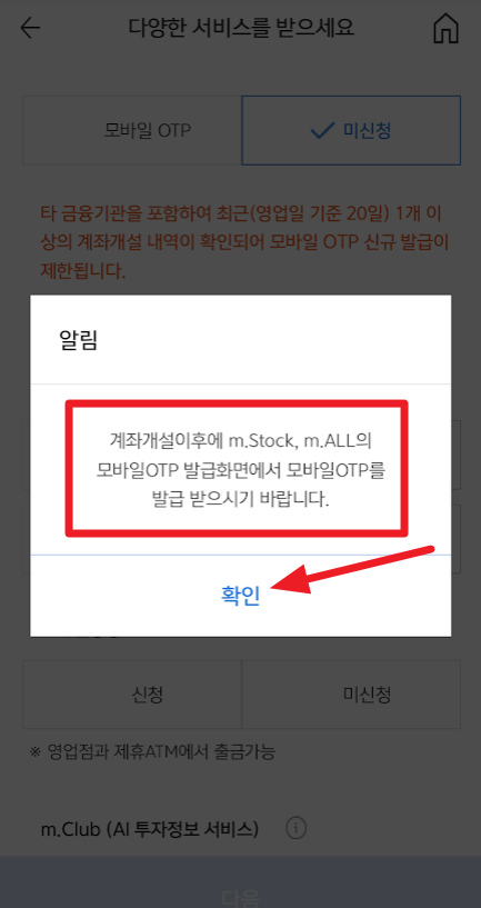 계좌 개설 이후에 m.Stock (이 앱이랑 다른 앱입니다), 또는 m.ALL(이 앱입니다.)의 모바일 OTP 발급 화면에서 모바일 OTP를 발급받으라고 합니다. "확인"을 누릅니다.
