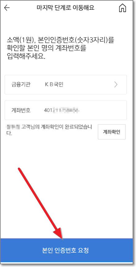 우선 본인계좌가 맞으면 맞다고 나오고, 그리고 1원을 받도록 밑에 "본인 인증번호 요청"을 누릅니다.