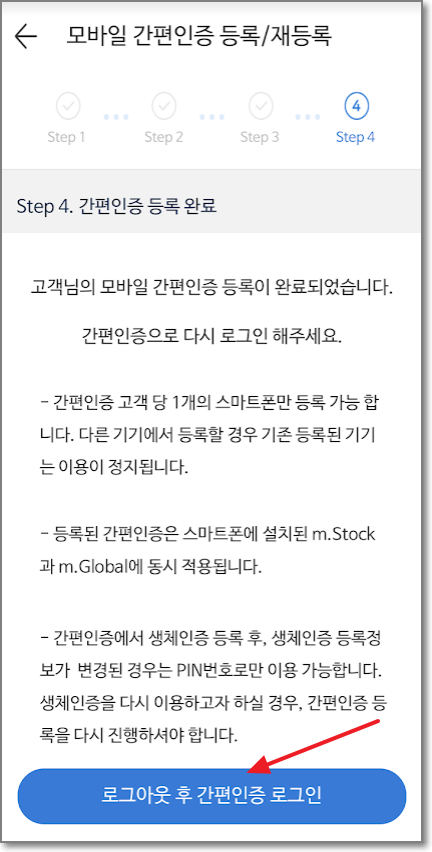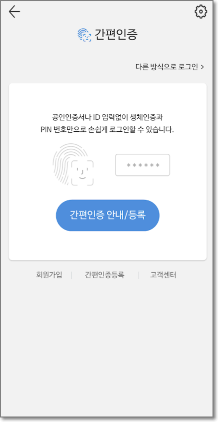 이제 간편 인증 등록까지 완료가 되었습니다. 로그아웃 후 간편인증 로그인을 누릅니다.