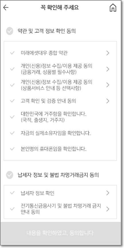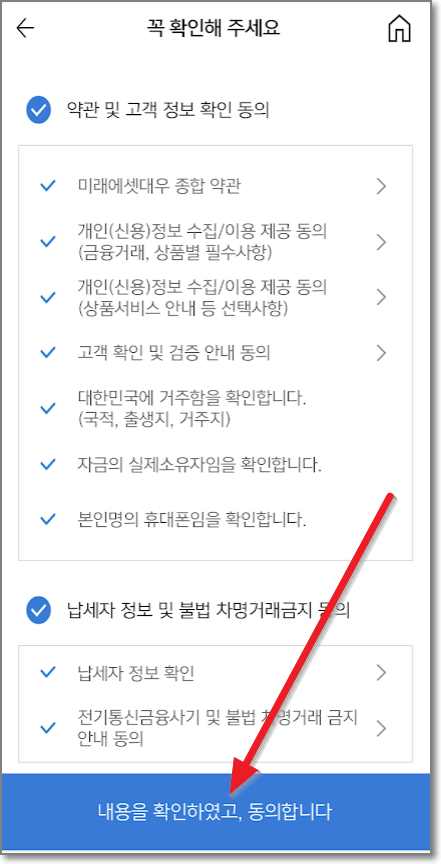 전기통신 금융사기 피해예방 및 불법/탈법 차명거래 금지 안내도 "확인"을 누르고, 다음 화면에서 "내용을 확인하였고, 동의합니다"를 누릅니다.