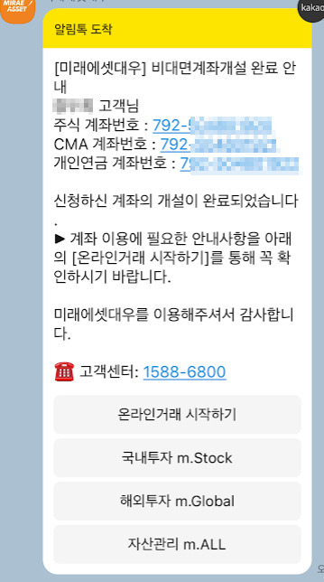 아까 신청한 계좌가 개설된 모양입니다. 아래 같은 카카오톡이 왔습니다.