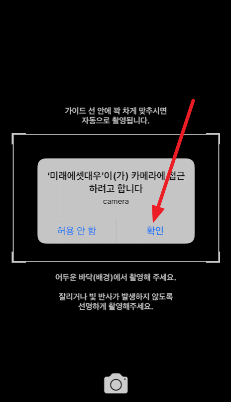 신분증 촬영을 위해서 카메라가 뜨는데요. 카메라가 접근한다고 하면 확인을 누르시고 신분증이 칸에 꽉 차게 비추면 알아서 촬영됩니다. (촬영 버튼 누를 필요 없습니다.)