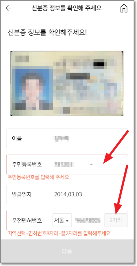 찍고 나면 카메라가 인식하지 못한 부분을 입력하라고 합니다. 필요한 사항을 입력하고 "다음"을 누릅니다.
