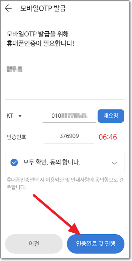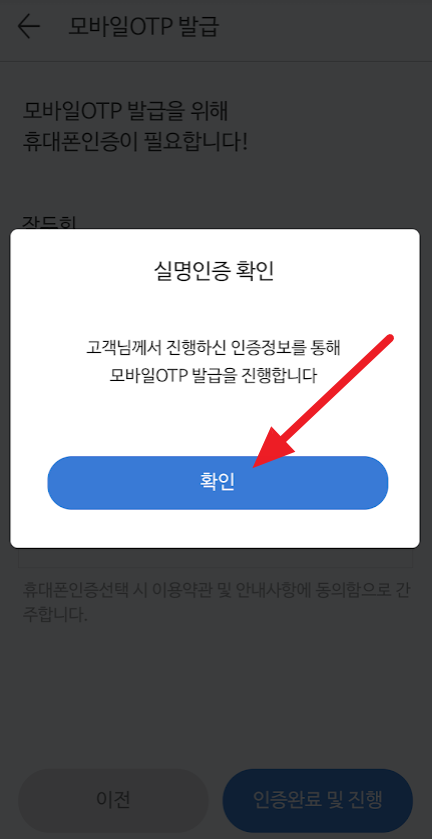 모바일 OTP 발급을 위해 휴대폰 인증이 필요합니다. 휴대폰 번호를 입력하고 인증번호를 받고 "인증번호"입력 후, "인증 완료 및 진행"을 누르고, 실명인증 확인 창에서 "확인"을 누릅니다.