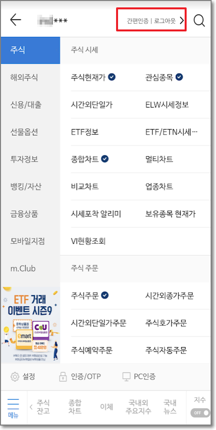 간편 인증이기 때문에 얼굴 인증이나 지문인증으로 들어가게 될 것입니다. 빨간 박스처럼 "로그아웃"이라고 쓰여있으면 로그인 상태인 것입니다.
