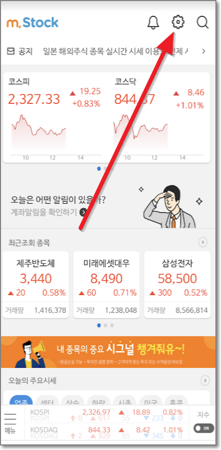 m.Stock앱을 실행하고 오른쪽 위에 톱니바퀴를 누릅니다.