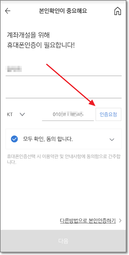 문자로 온 인증번호를 인증번호란에 입력하고 "다음"을 누릅니다.