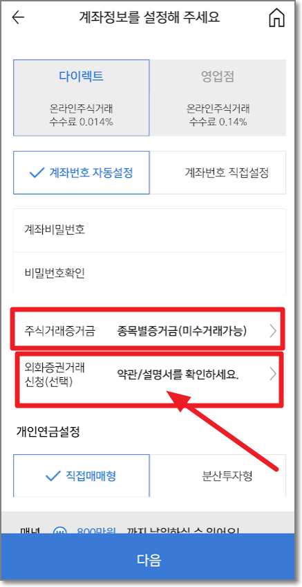 개인연금 설정을 하는데요. 매년 800만 원까지 납입할 수 있다고 하는데요. 연간 납입한도를 800만 원으로 적어놓으시면 됩니다. 이 연금저축은 입금을 해야만 처리가 일어나므로 원할 때 입금을 시작하시면 되는 계좌입니다. 이제 다음을 누릅니다.