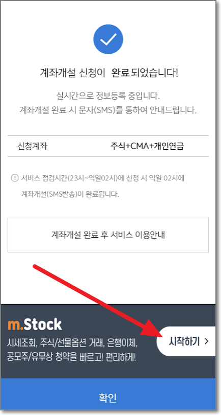 이렇게 해서 계좌 개설 신청은 우선 완료되었습니다. 계좌 개설이 완료되면 문자(SMS)로 내용이 온다고 합니다. 잠시 시간이 걸릴 수 있으니까, 기다리는 동안 m.Sotck를 다운로드합니다. 화살표 친 "시작하기"를 누릅니다.