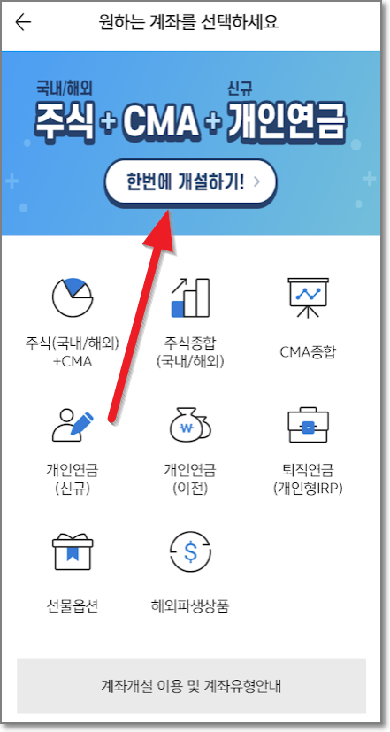 국내/해외 주식+CMA+개인연금 까지 "한 번에 개설하기"를 누릅니다.