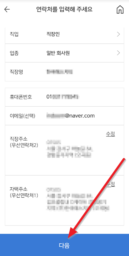 업종, 직장명, 휴대폰 번호, 이메일, 직장 주소, 자택 주소를 입력하고 "다음"을 누릅니다.(업종 무직으로 해도 아무 상관없습니다.)