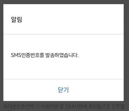 SMS 인증번호를 발송했다고 뜹니다. 닫기를 누릅니다.