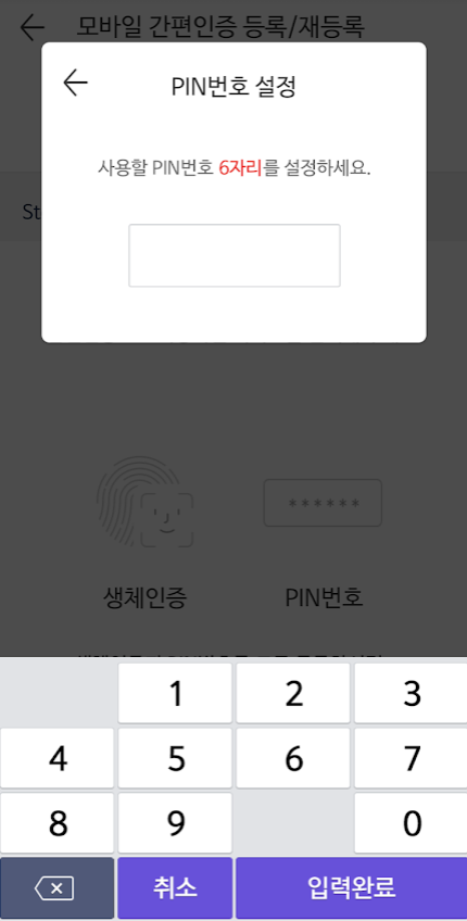 그럼 문자가 오고 인증번호 입력 후에 "인증 완료 및 진행"을 누르면 나오는 화면에서 "생체인증+PIN등록"을 누릅니다.