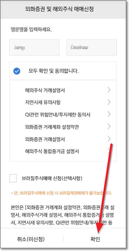 이제 다음을 보면, "주식거래증거금이 종목별 증거금(미수거래가능)"으로 하시고요. 밑에 외화증권거래신청(선택)은 약관/설명서를 확인하세요를 누르고 "모두 확인 및 동의합니다"를 누르고 밑에 "확인"을 누릅니다.