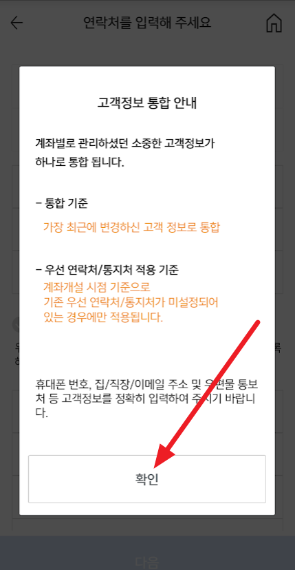 정보 전송 확인에서 "확인"을 누르고, 고객정보 통합 안내에서 "확인"을 누릅니다.