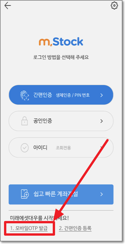 다시 m.Stock 첫 화면으로 가서 톱니를 누르고 로그인 방법을 "간편 인증"으로 선택하고 누릅니다.