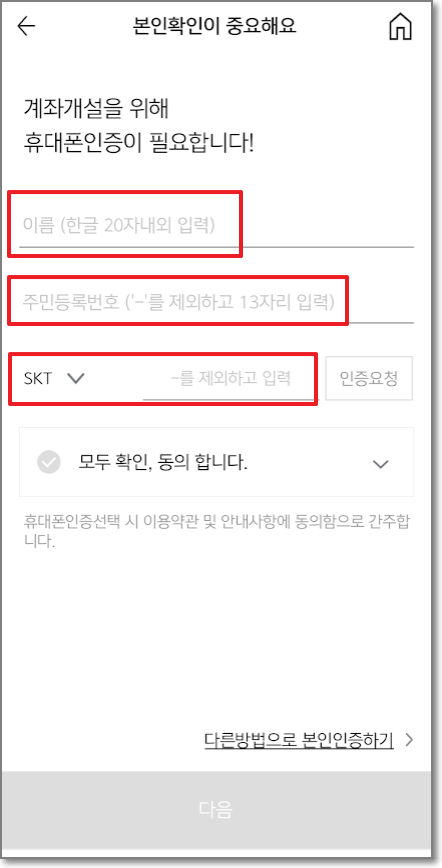 성명, 주민번호, 계좌번호(주식계좌번호), 비밀번호를 쓰고 "다음"을 눌러서 모바일 간편 인증을 전체 동의 및 SMS 인증 요청을 누릅니다.
