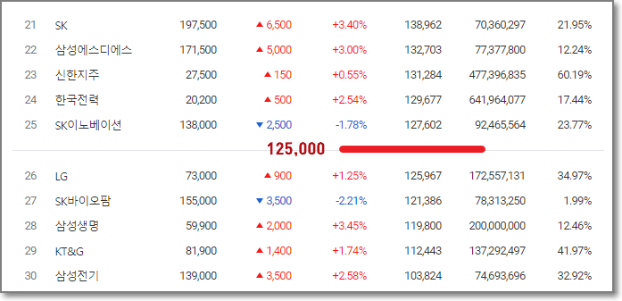 만약에 빅히트가 상장 당일 따상(공모가격의 2배 즉 더블로 시초가격 형성하고 30%상한가로 상승)을 기록할 경우 주가는 35만1천원까지 오를 수 있으며 이 경우 빅히트의 시가총액은 약 12조5천억까지 증가해서 코스피 시장 시총 20위권으로 진입할 수도 있다는 전망이 나오고 있습니다. 아래 참고해보면 20위권중에 26위정도 할 수 있겠네요.
