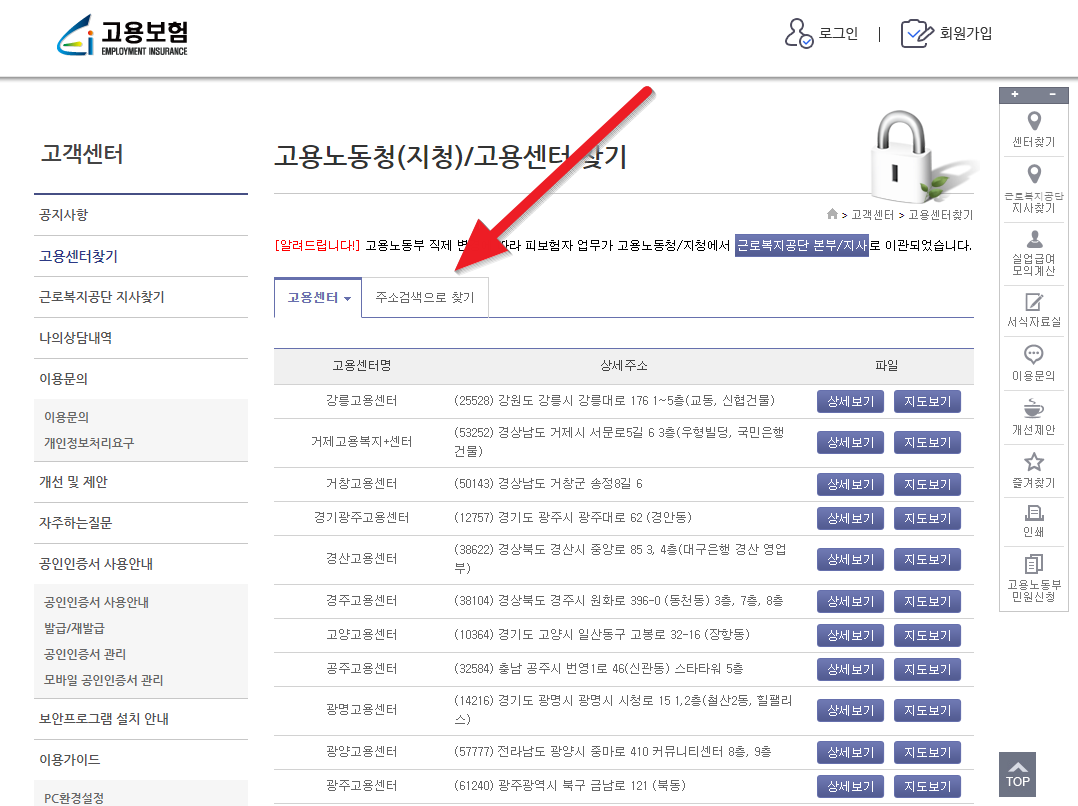 가까운 고용센터는 아래 있는 링크를 누르시고 아래와 같은 화면이 나오면 "주소검색으로 찾기"를 누르셔서 근처에 있는 고용센터를 확인하시면 됩니다.