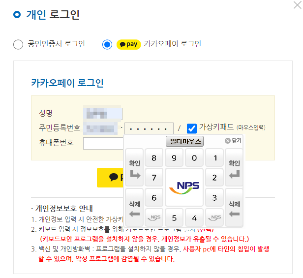 아래화면처럼 성명과 주민번호 휴대폰번호를 쓰고 카카오페이 로그인을 누릅니다.
