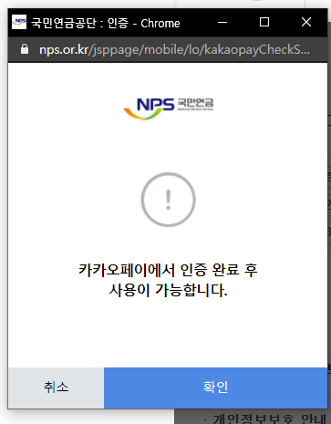 우선 아래에 링크해놓은 국민연금 전자민원 서비스로 들어갑니다. 그리고 카카오페이 로그인을 누릅니다.