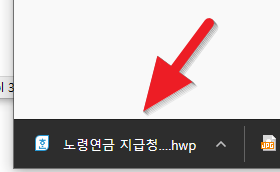 그러면 화면 왼쪽 아래에 다음과 같이 "노령연금 지급청구서.hwp"가 보입니다. 누르세요.