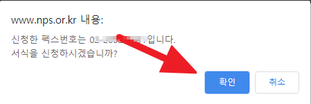아래처럼 "신청한 팩스번호는 ㅇㅇㅇㅇ번 입니다. 서식을 신청하시겠습니까? 에 "확인"을 누르세요.