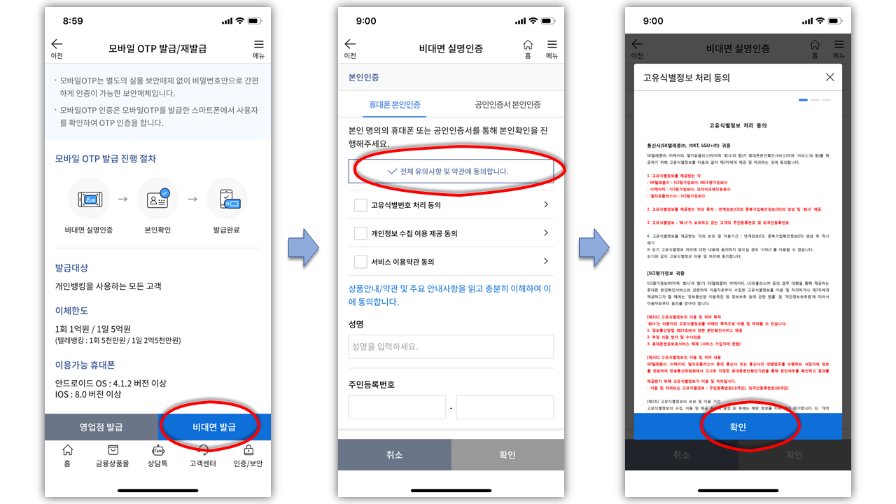 V전체 유의사항 및 약관에 동의합니다. 누르고 나오는 고유식별정보 처리 동의사항을 읽어보고 "확인"을 누릅니다.