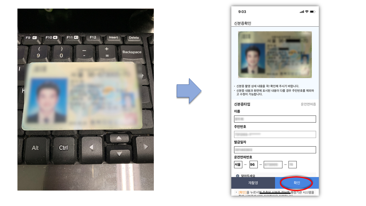 찍자마자 알아서 이름과 주민번호 발급일자 등 각종 정보를 읽어들여서 표시합니다. 로봇이 제대로 읽었나 한번 쓱 확인해주시고 나서 "확인"을 누릅니다.