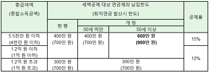 노후대비가 필요한 50세 이상은 세액공제 대상 연금계좌 납입한도가 3년간 한시적으로 상향조정 되었습니다. (단, 총급여액 1.2억원 즉 종합소득금액 1억원 초과자 또는 금융소득 종합과세 대상자는 제외)